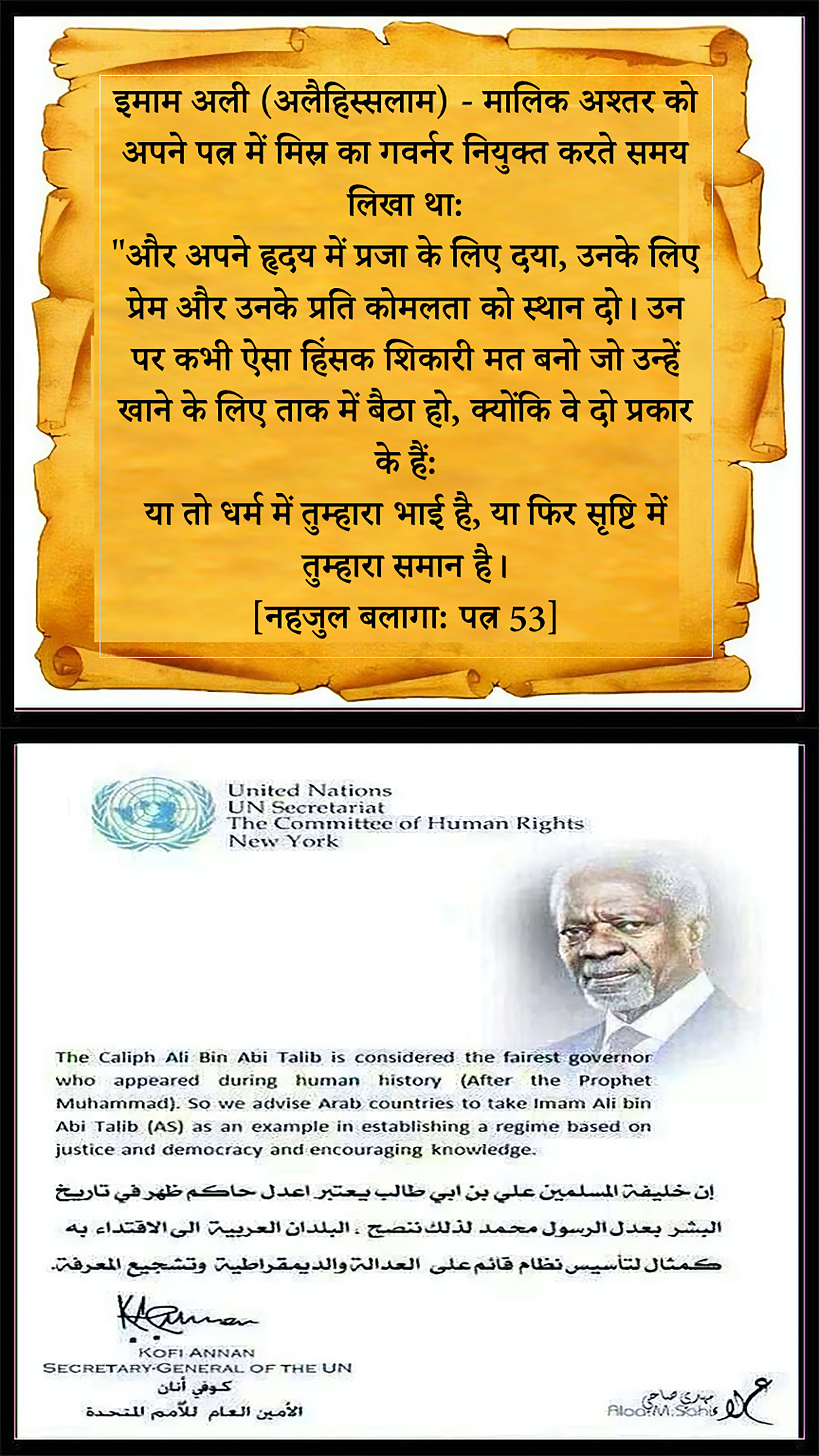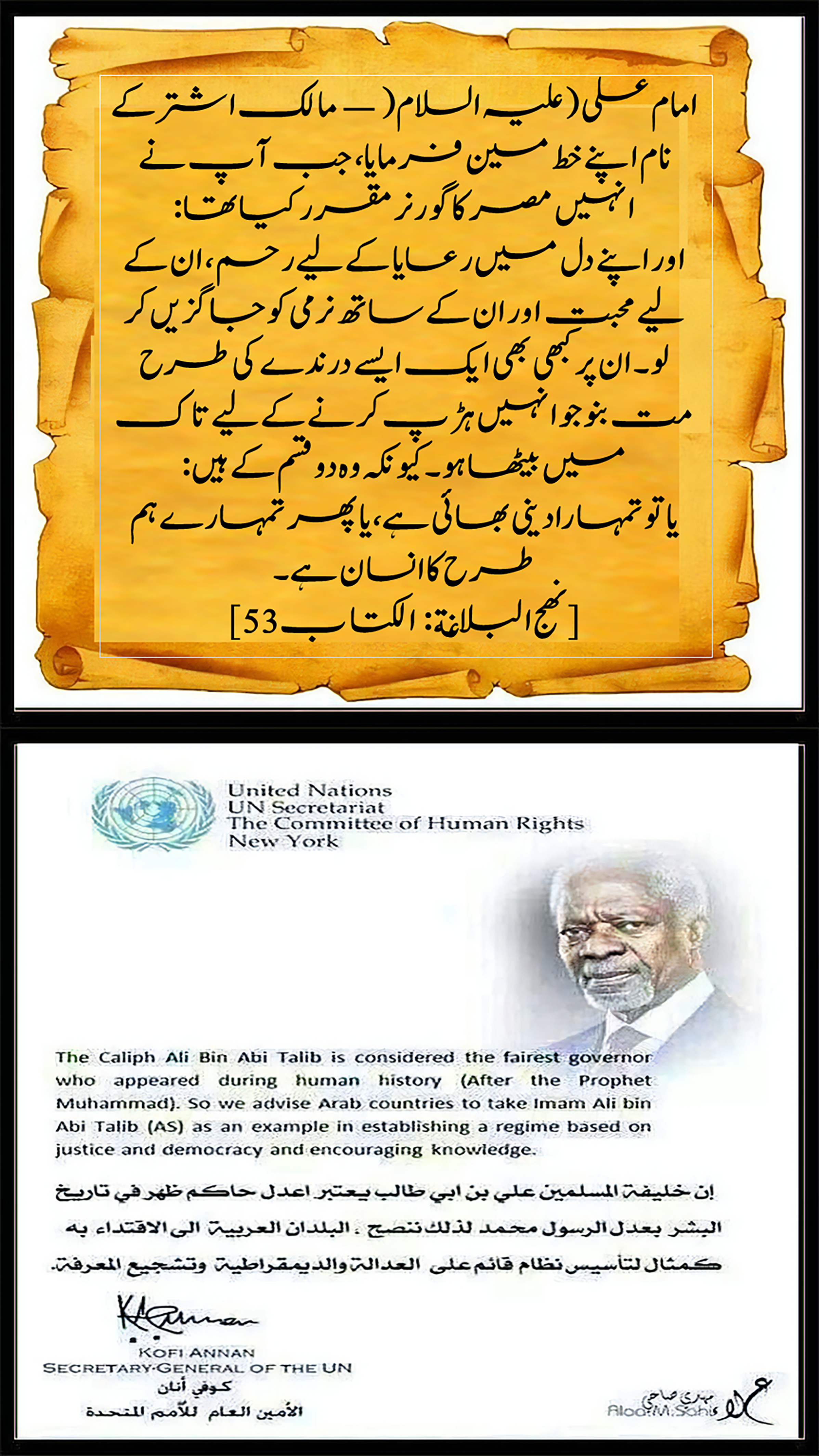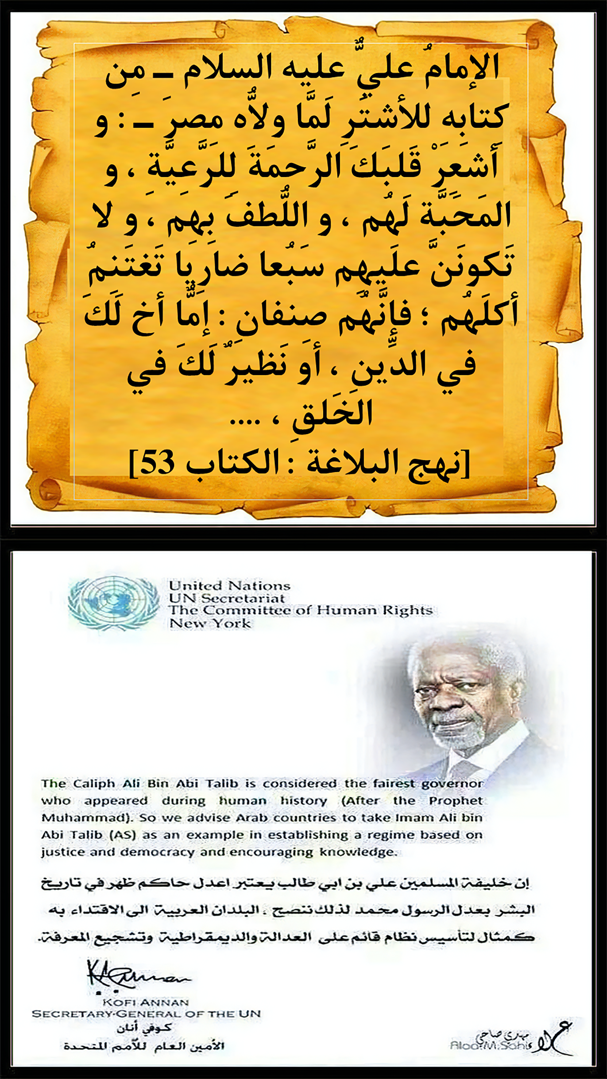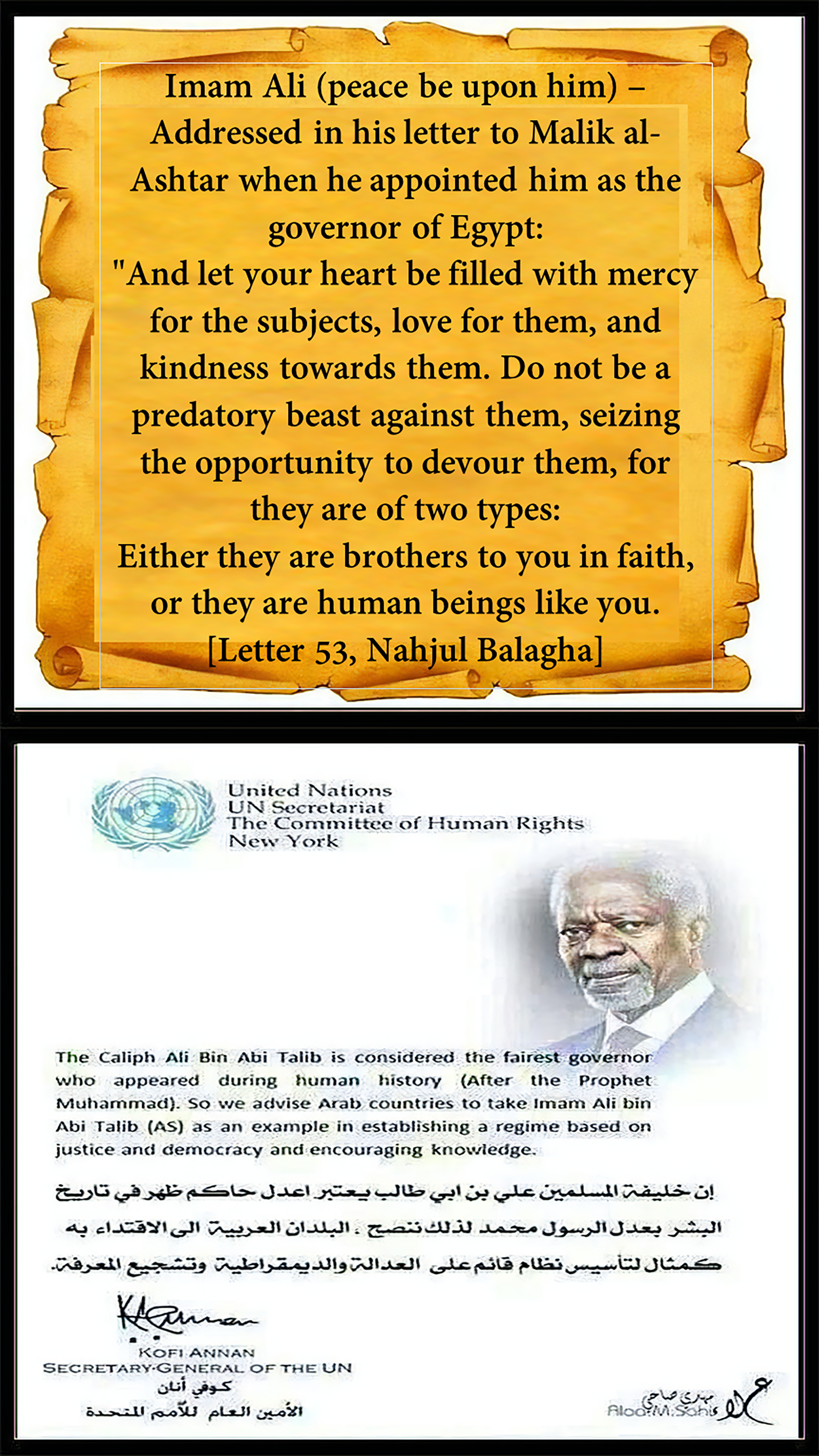 Imam Ali (peace be upon him) – Addressed in his letter to Malik al-Ashtar when he appointed him as the governor of Egypt: "And let your heart be filled with mercy for the subjects, love for them, and kindness towards them. Do not be a predatory beast against them, seizing the opportunity to devour them, for they are of two types: Either they are brothers to you in faith, or they are human beings like you.